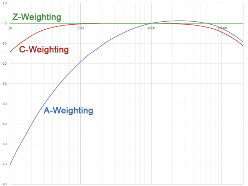 ‘C’ frequency weighting – At higher sound levels (volumes), our ears have a flatter response, and this C weighting is used to represent that, giving much more emphasis to low frequency sounds. This is commonly used for peak sound pressure level.